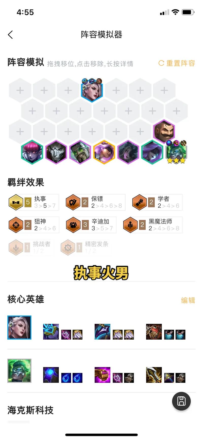 阵容组成:阵容组成:火男,婕拉,辛德拉,男刀,蕾欧娜,布隆,狐狸,泽丽组成羁绊:5执事,3辛迪加,2黑魔法师,2保镖,2学者。这套阵容以火男为主c,可以说非常快乐,只要运营的好拿来上分也是可以的。