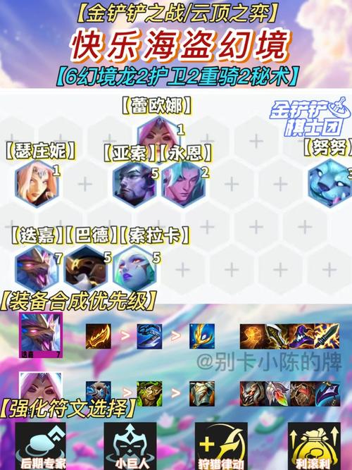 〖One〗、在金铲铲之战S7赛季中,幻境龙的玩法推荐阵容被称为幻镜龙迭嘉,它由六名幻镜龙、四名重骑兵、一名龙神、两名狂刃战士和一名冒险家组成。强化符文的最佳选取包括幻像、代谢增速器和珠光莲花,备选符文有复苏之风、重骑兵之徽和幻镜龙之徽。