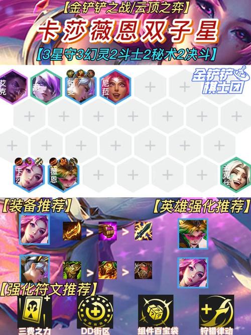 赌狗艾希阵容包括:艾希、布里茨、雷克顿、卡蜜尔、亚索、伊泽瑞尔、薇恩、卡莎,羁绊为4情报特工、3源计划:激光特工、2AI程序、2决斗、2斗士。黑客劫 黑客劫阵容有亚索、艾克、赫卡里姆、瑟庄妮、蔚、劫、薇恩、尼菈、佐伊,羁绊包括4决斗大师、3源计划、2斗士、2秘术卫士、2黑客、2淘气包。