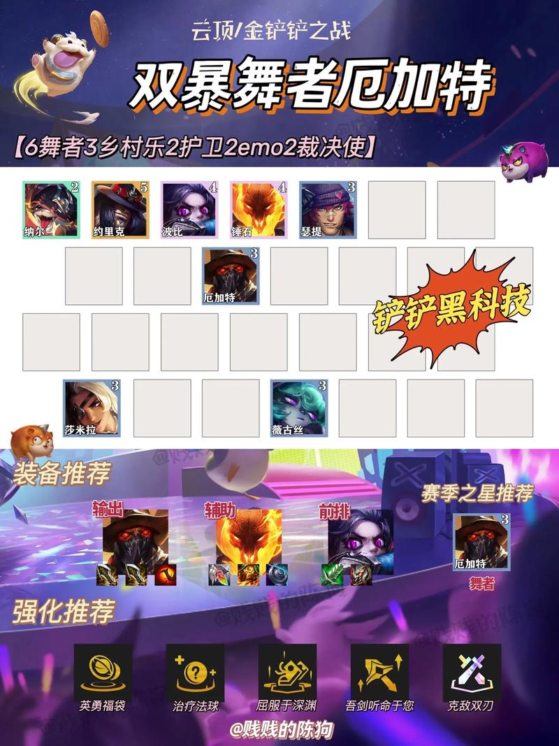 〖Three〗、金铲铲之战6舞者厄加特阵容推荐【6舞者厄加特】阵容站位 阵容站位主打一个不用动,懒人站位,有吹风可以动一下。装备分析 装备必须暴力,主打一个秒杀对面前排。强化分析 强化符文屈服于舞者这个版本大加强,看到必选,其次就是一个战力类和抽三星的经济类强化都不错。