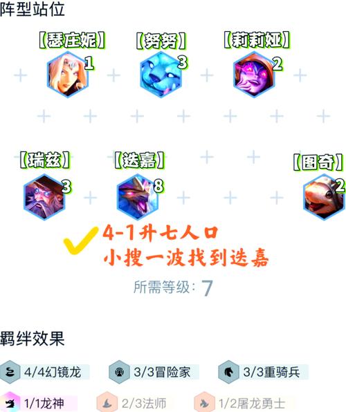 在金铲铲之战S7赛季的巨龙之巢中,迭嘉作为8费的幻境龙神,是幻境龙阵容的重要组成部分。以下是一份详细的迭嘉主C玩法攻略,帮助你更好地理解和操作这个阵容。阵容构建核心阵容包括猪妹、莉莉娅、永恩、雪人、人马、迭嘉和亚索。通过这些角色的搭配,形成相应的羁绊和战术。