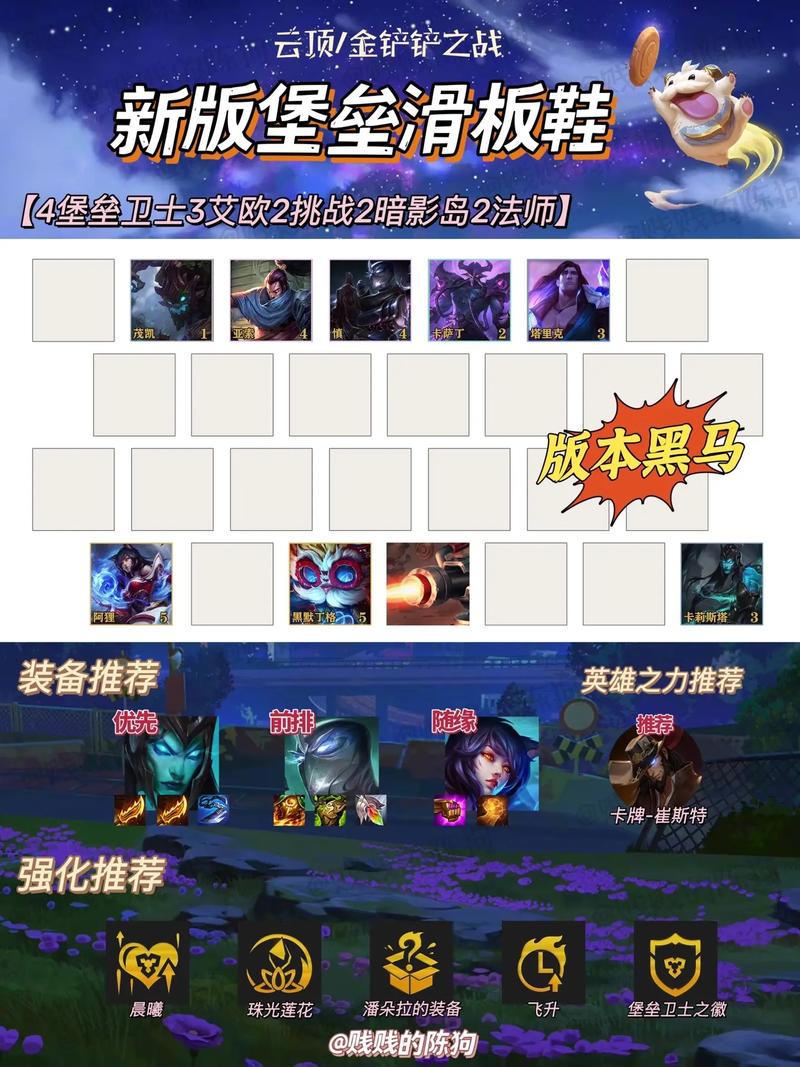 〖One〗、波比、卡密尔、塔里克、黛安娜、洛、莫甘娜、基兰、卡莉斯塔 思路就是4堡垒+3魔战士,这个搭配属于一个单C阵容,完成9人口后,那么上分非常的快了。