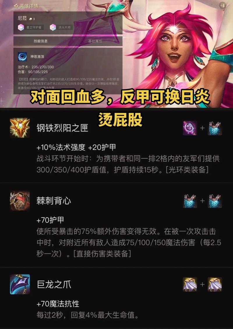 〖Three〗、装备优先:钢铁烈阳之匣 2阶段:开局优先拿锁子甲无用大棒,锁子甲可以合成夜之锋刃,这个是劫必备的装备,而大棒只能够合成钢铁烈阳之匣,因此优先拿锁子甲。2-1拉4人口,2-5拉5人口,2阶段选秀一定要拿到一个钢铁烈阳之匣,这个装备非常重要。