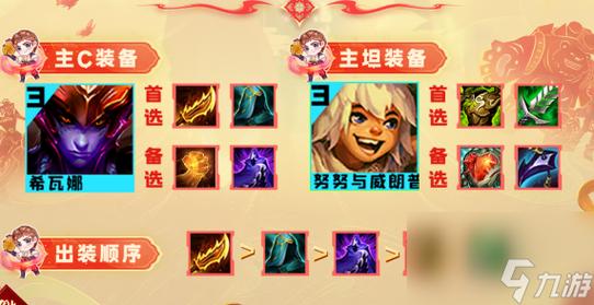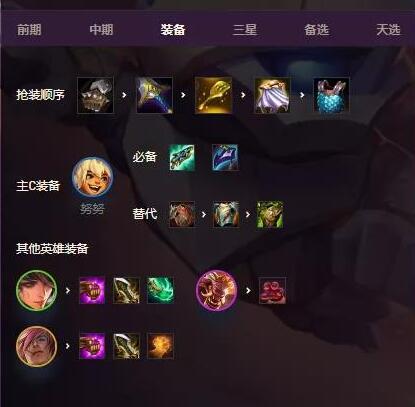 〖Six〗、龙牙、反甲、狂徒、救赎这4个最优,可选其二。斗森林努努阵容攻略阵容组成阵容站位站位一瑟提单顶第一排早点开出第一个大去仰卧起坐,其他弈子下方一字排开。装备推荐优先保证努努的棘刺背心汲取剑,之后瑟提捡法术装备,龙女捡物理装备。金铲铲之战S5神龙努努攻略推荐速6打法。