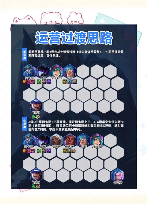 后排之迅、便携锻炉、代谢增强器、小巨人、未来视野、狩猎律动、星界赐福等。总结:这是套刺客阵容,对站位要求极高,特别是需要理解男刀男刀与机器人和辛德拉的联动,另外一个就是蕾欧娜站位是否能找到敌方人群,如果是机器人找敌方人群,很容易快速被秒,之后就会转火男刀,导致败北。