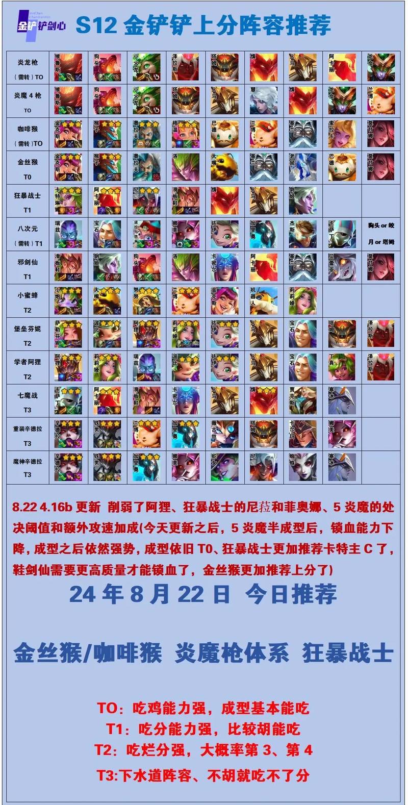 金铲铲之战天梯上分阵容及英雄组合推荐:剑枪——炸药桶阵容 棋子构成:暮光之眼、青钢影、无畏重炮、地火霸主、驱邪圣枪、双枪女帝、暴走萝莉、麦田炮手。核心英雄:无畏重炮作为主C,装备火炮、法爆、复活甲。阵容特点:4枪3剑配置,后期可考虑6剑士,需要追三星无畏重炮,稳定吃分,3星吃鸡概率高。