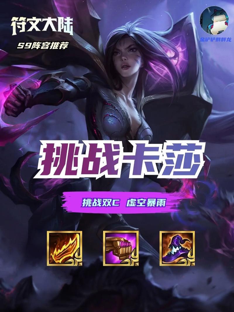 金铲铲之战S5卡莎主C攻略首先核心符文公理圆弧(极其重要甚至推荐大家在有这个符文的情况下再选取玩卡莎银金皆可)。理论来讲链路也凑合,可以减少一次平A,其他的飞升,复苏都很好用。阵容组成:2套组合以高神龙为体系的神龙卡莎,以及以高护卫为体系的护卫卡莎。