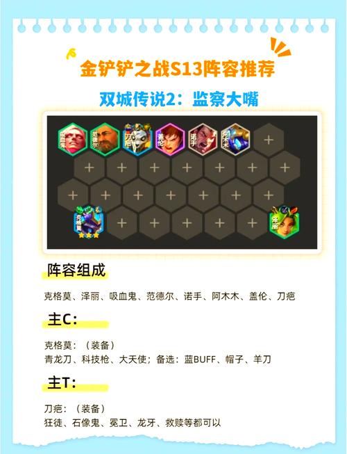 阵容一:圣盾大嘴大嘴作为核心输出角色,推荐装备为羊刀、巨杀和水银。羊刀和巨杀是必备装备,以提高其输出能力。盖伦作为副C角色,不仅能充当前排坦克,还能在残局时进行收割。装备建议以肉装和回复装为主。