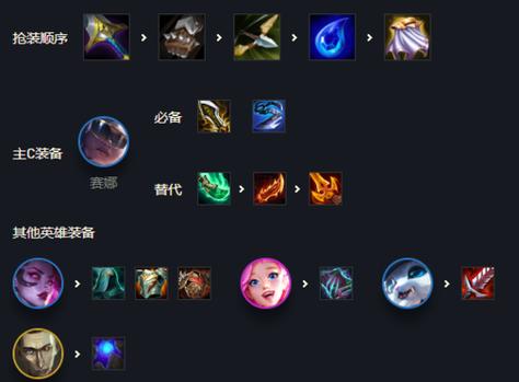主C赛娜必备装备为最后的轻语和无尽之刃,其次选巨杀和青龙刀。最后的轻语能够提供额外的暴击几率,而无尽之刃则大幅提升暴击伤害。巨杀和青龙刀则是提高输出和生存的关键装备。莫甘娜作为前排可以装备狂徒,龙牙和棘刺背心。狂徒能够提供额外的生命值,龙牙则提升护甲,而棘刺背心则增加对敌方后排的伤害。
