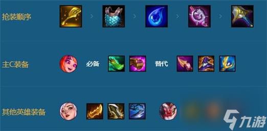 阵容一:圣盾大嘴大嘴作为核心输出角色,推荐装备为羊刀、巨杀和水银。羊刀和巨杀是必备装备,以提高其输出能力。盖伦作为副C角色,不仅能充当前排坦克,还能在残局时进行收割。装备建议以肉装和回复装为主。