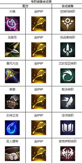 云顶之弈s9铲子合成表是金铲铲+大剑=艾欧尼亚转职、金铲铲+大棒=恕瑞玛转职、金铲铲+斗篷=德玛西亚转职、金铲铲+腰带=诺克萨斯转职、金铲铲+攻速=挑战者转职、金铲铲+眼泪=法师转职、金铲铲+锁子甲=主宰转职。