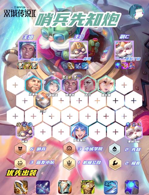 〖One〗、- 前期:重点争夺暴风大剑、反曲之弓和巨人腰带,力求连胜过渡。在3-2人口时,可以选取3神盾或3哨兵搭配其他羁绊。- 中期:在4-1人口时提升至7人口,厄斐琉斯加入后根据实际情况调整羁绊,如物理输出较多则加入铁甲,法系输出占主导则考虑熊菊复生组合。