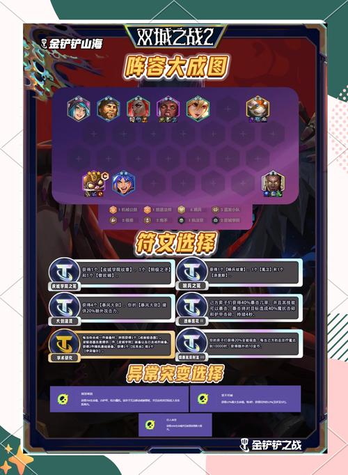 金铲铲之战双城传说阵容推荐包括七发明家巨龙登场、黑玫体系、哨兵体系以及极客体系等。首先,七发明家巨龙登场阵容是一个成型后非常强势的选取。这个阵容以塔里克为主坦,萨勒芬妮为主C,杰斯为副C,配合其他发明家和辅助棋子,可以形成强大的羁绊效果。