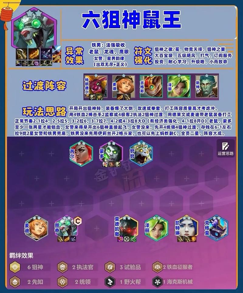 〖Five〗、阵容组成:伊泽瑞尔(EZ)、基兰、辛吉德、艾克、萨勒芬妮、泽丽。7发明家2精密狙击神2极客。海克斯选取上,功能类推荐发明之心、自我修复、潘多拉的装备。战力类推荐直击弱点、后排迅、星界祝福。防御类则有神盾使、浪人、后排坚强。装备选取上,泽丽推荐水银(拳套、斗篷)和正义(拳套、水滴)。