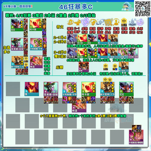 阵容介绍:术法双修维克兹标准阵容为:4术士、4法师、3司令、3德玛西亚。在6人口时,组合为斯维因、塔莉娅、提莫、塔里克、娑娜、维克兹,形成4术士3法师。7人口时,上拉克丝,阵容变为4法师。8人口时,上皇子,阵容增加3德玛西亚3司令,完成最终阵容。
