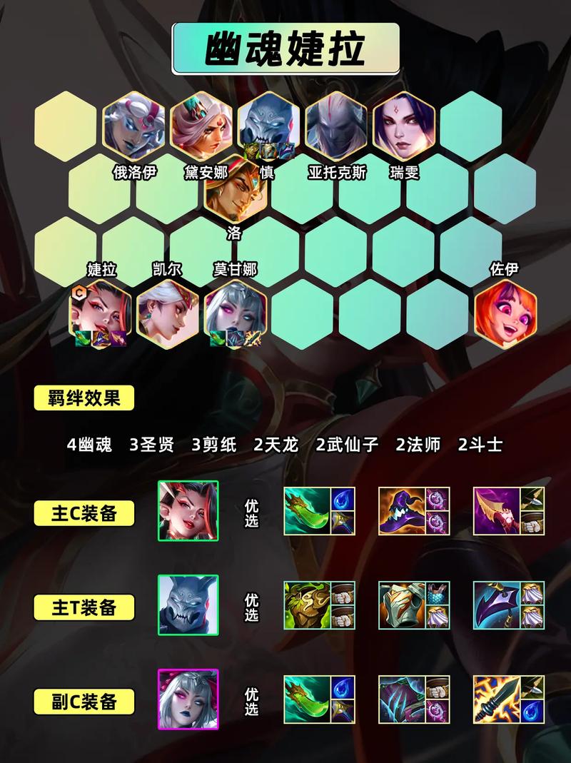 〖Two〗、阵容一:拼多多小法阵容,主要英雄包括战争之影-赫里卡姆、魂锁典狱长-锤石、魔蛇之拥-卡西奥佩娅、仙灵女巫-璐璐、邪恶小法师-维迦、唤潮鲛姬-娜美、风暴之怒-迦娜。核心英雄维迦的装备推荐为:蓝BUFF(泪滴+泪滴)、科技枪(大剑+大棒)、正义之手(拳套+泪滴)。