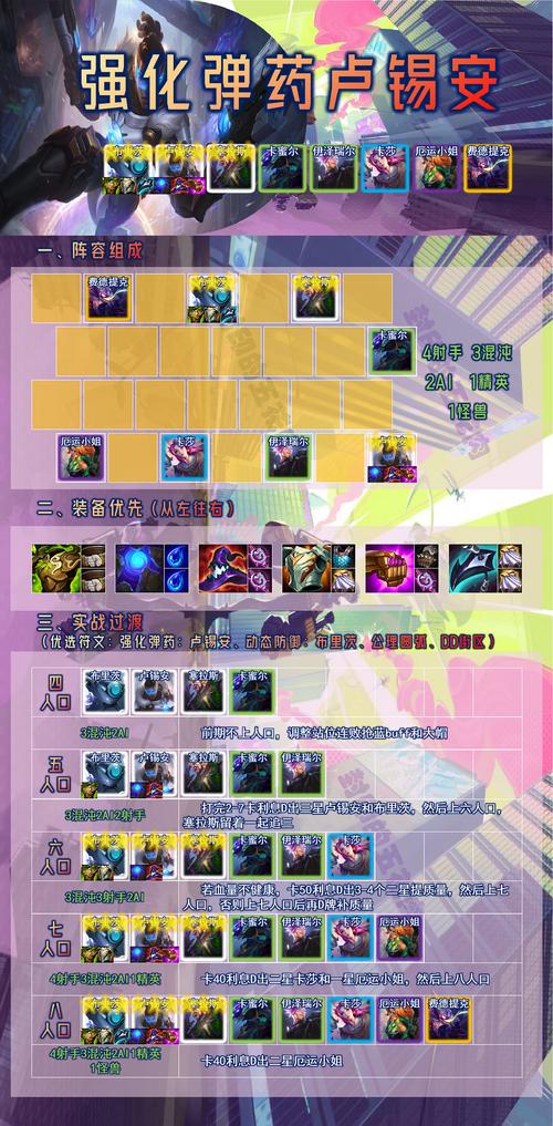 阵容分析 组成与羁绊组成英雄:潘森、卢锡安、希维尔、慎、莎弥拉、厄加特、终极伊泽瑞尔以及费德提克。羁绊效果:5/7未来战士,3/4枪手,2怪兽,1堕落,1精英。强化推荐潘森强化:选取比较好的进攻,提升战斗力。希维尔强化:加班费是优先选项,能带来经济奖励,尤其在中期补给阶段非常有用。