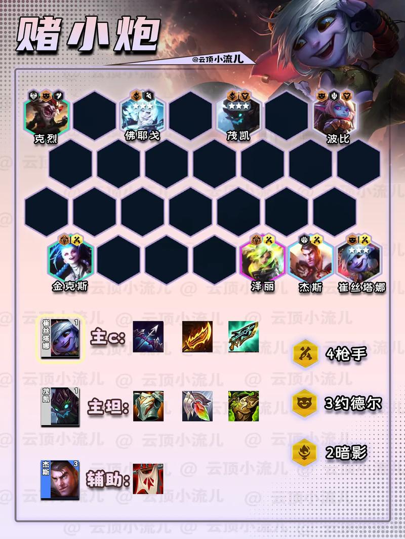 〖Three〗、阵容三:赌卡特这是一套基于卡特的赌狗阵容,卡特作为一张低费卡具备成为核心输出的潜力。这套阵容相对简单,易于成型,但缺点是后期战斗力不足。