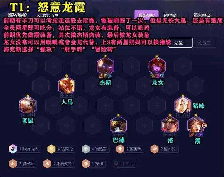 棋子组成:ez、维鲁斯、霞、老鼠、狗头、女坦、洛、布隆。羁绊组成:4射手+4护卫+2怒翼+1冒险。装备选取:核心装备:①ez:巨杀、大帽、电刀/正义/大天使。②布隆:狂徒+石像鬼+日炎。③维鲁斯:吸蓝刀、羊刀、分裂箭。巨龙强化:强攻、羽量级、超级加倍、珠光莲花等等。