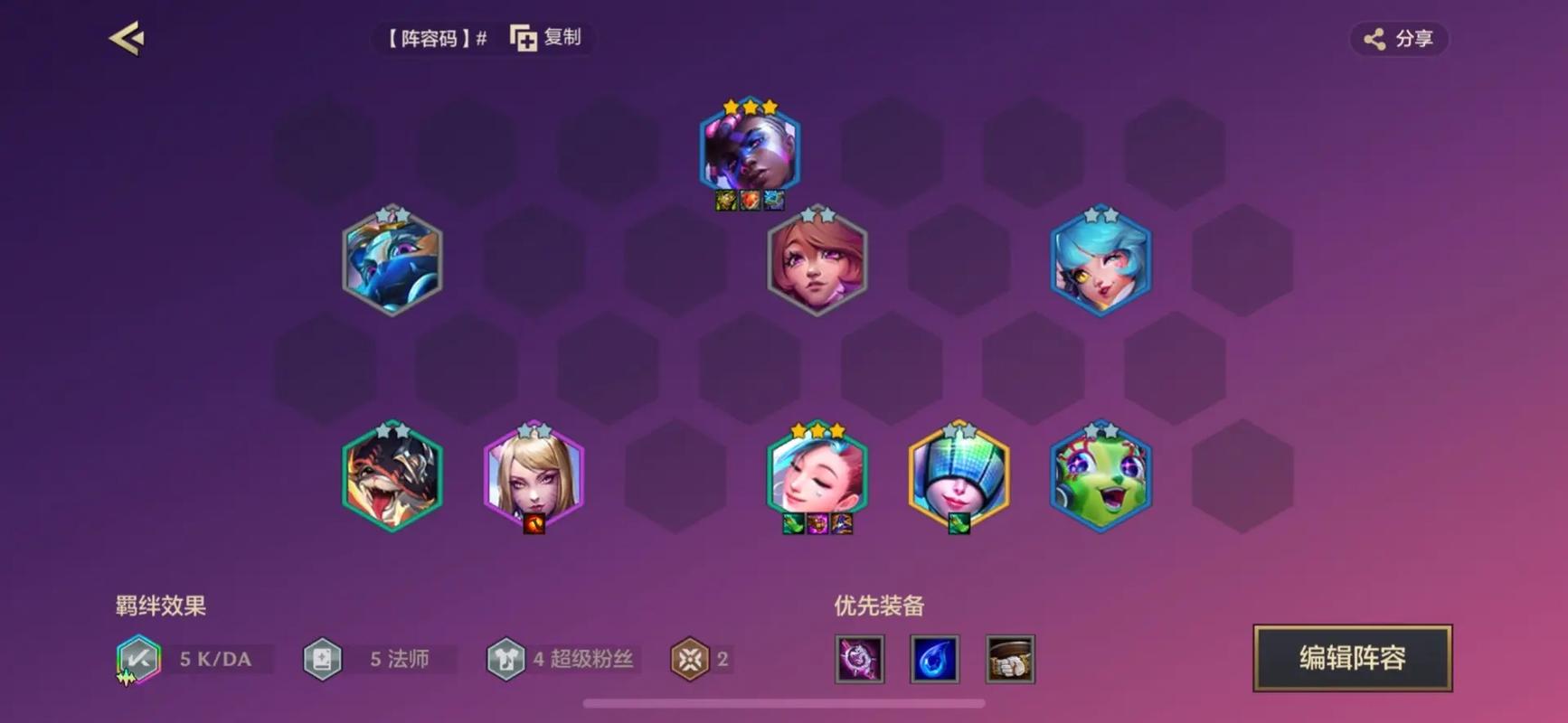 阵容组成:堕落天使—莫甘娜、破败之王—佛耶戈、诡术妖姬—乐芙兰、祖 安怒兽—沃里克、冰霜女巫—丽桑卓、永猎双子—千珏、符文法师—瑞兹、光辉女郎—拉克丝。开局就是拿眼泪,无脑拿眼泪,这套阵容能消化非常多的眼泪,我们选秀主要是拿小法师的装备就行。