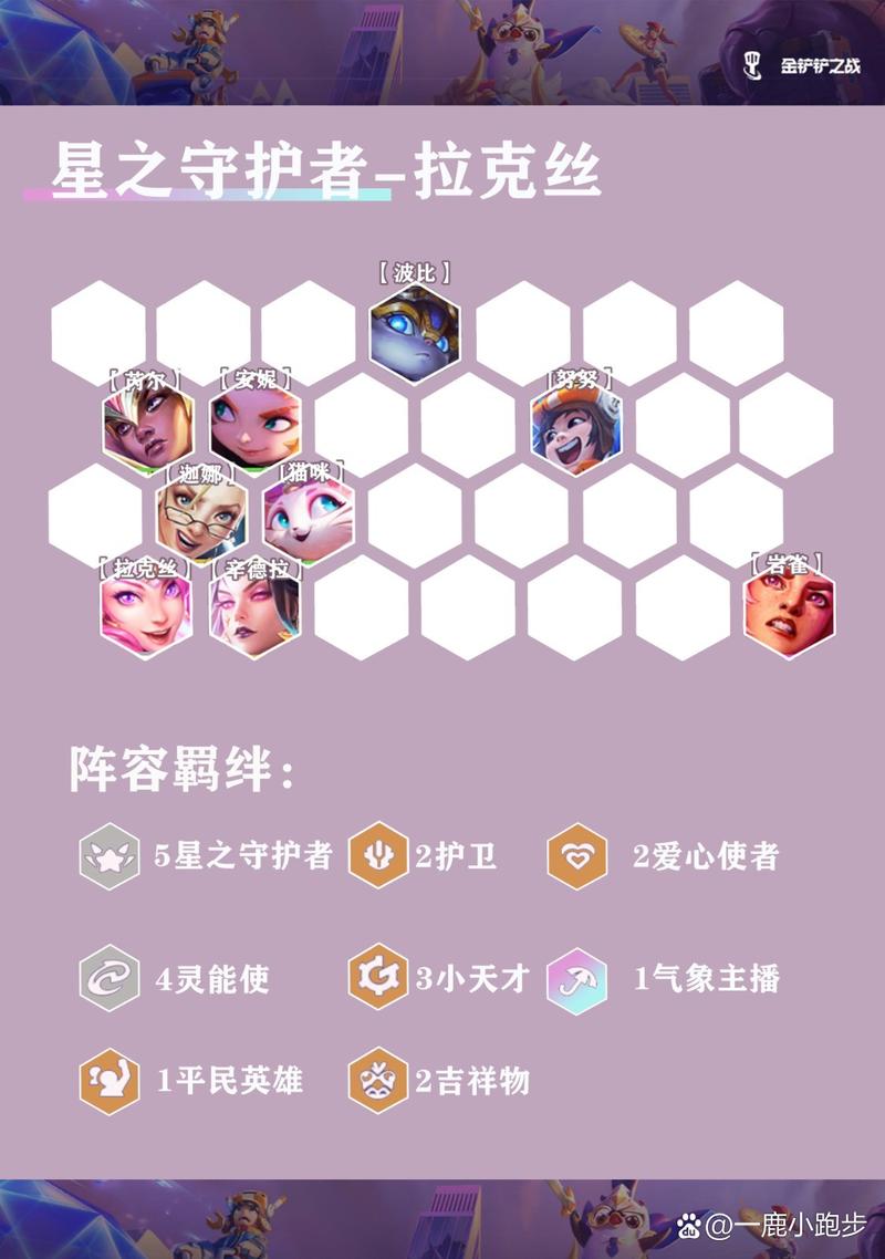 〖Two〗、在金铲铲之战s5赛季中,启明奇点拉克丝阵容的构成包括:拉克丝、崔斯特、尼菈、迦娜、辛德拉、妮蔻、娑娜、安妮。其中,羁绊由6灵能使、1气象主播、4星之守护者、2福牛守护者、2决斗大师、2爱心使者组成。