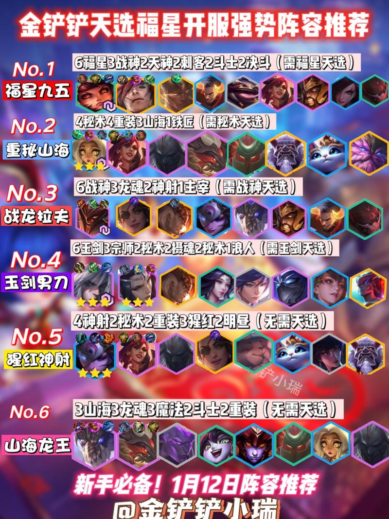 ③前期过渡策略:根据二星卡搭配羁绊即可,如果运气好,可以直接以福星天选开局,其次考虑三福星。前期阵容如下,可根据实际情况灵活调整。④如果前期没有获得福星天选,需要通过运营来过渡到至少七级,以便有机会D到福星天选。