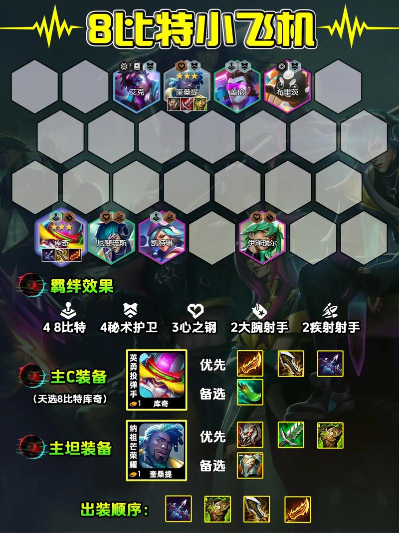 〖Two〗、要打爆金铲铲之战中的8比特游戏机,关键在于选取合适的阵容、装备,并制定合理的战术策略。以下是一些建议:核心阵容与羁绊:选取凯特琳、库奇、盖伦等核心英雄,他们能在游戏中发挥重要作用。激活6八比特、4秘术护卫等羁绊效果,以增强队伍的整体战斗力。