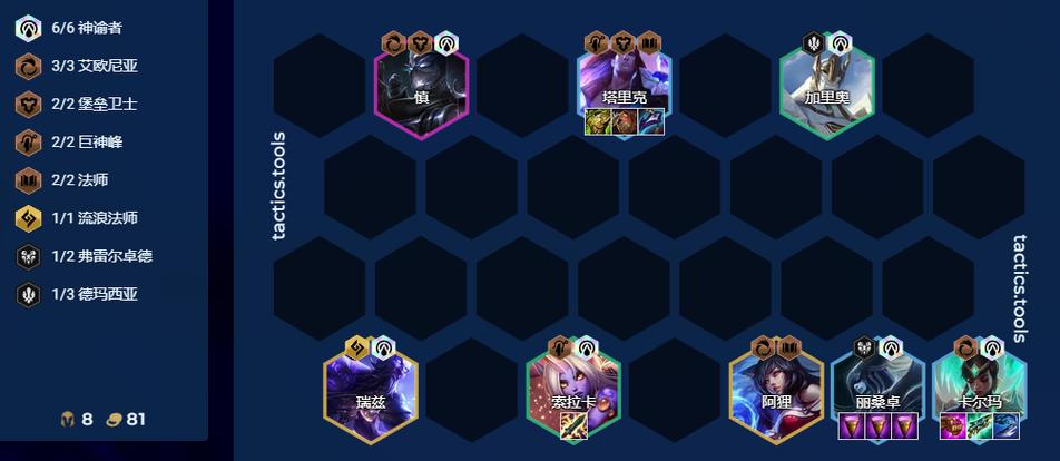 -2拉6人口搜一大波,开6法师3虚空(在有一个法转的情况下),把斯维因、塔里克等体系卡搜到两星,然后看数量和经济情况在6级D出三星斯维因或者上7找拉克丝,上8补阿狸,阵容成型,在有两个转职的情况下也可用慎和卡尔玛替换掉发条和卡莎。