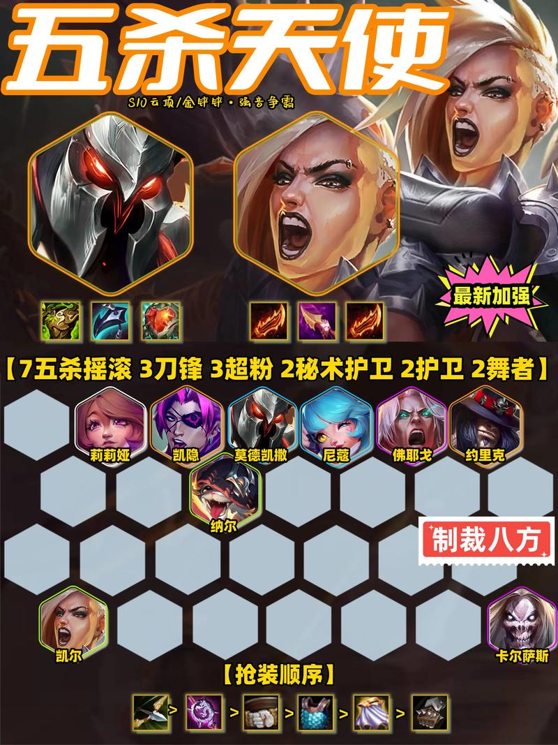 〖Four〗、阵容推荐:天使,李青,千珏,永恩,霞,慎,悠米,刀妹,贾克斯,组成羁绊为4天神4裁决3宗师。强化符文选取:优选狩猎律动2,珠光莲花,背水一战;次选狩猎律动1,未来视野1,生日礼物,明智消费,决斗大师之冕。