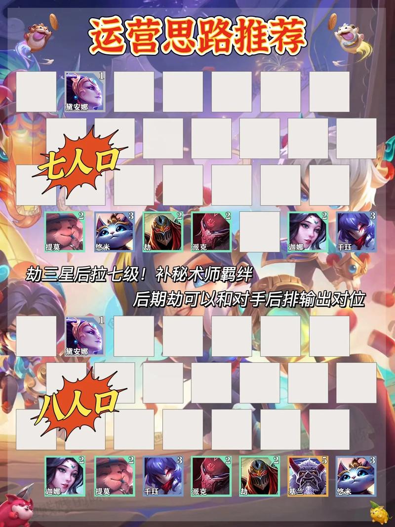 阵容节奏上,建议选取提莫和风女的天选,围绕4秘术、2神射和2明昼的羁绊进行。决赛圈非法系时,可灵活调整重装或神射。初期运营时,2阶段避免拉人口和D卡,优先攒钱,2-1阶段可适当贪图利息。3-2阶段寻找提莫和风女天选,如果没有理想人选,可用重装卡搭配锤石。