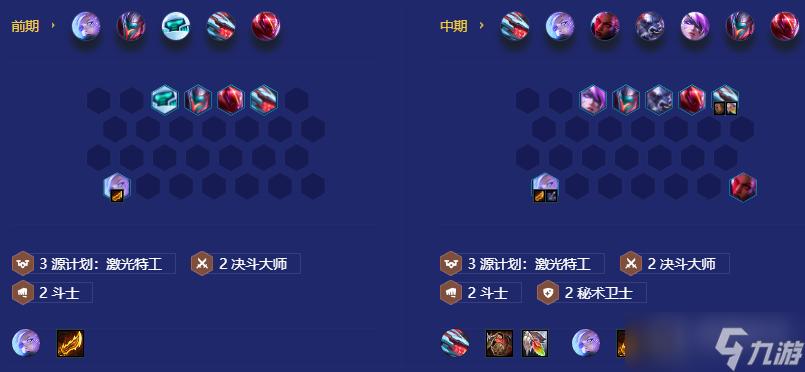 赌狗艾希阵容包括:艾希、布里茨、雷克顿、卡蜜尔、亚索、伊泽瑞尔、薇恩、卡莎,羁绊为4情报特工、3源计划:激光特工、2AI程序、2决斗、2斗士。黑客劫 黑客劫阵容有亚索、艾克、赫卡里姆、瑟庄妮、蔚、劫、薇恩、尼菈、佐伊,羁绊包括4决斗大师、3源计划、2斗士、2秘术卫士、2黑客、2淘气包。