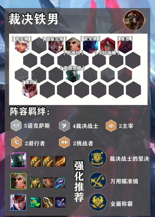 〖Two〗、阵容组成:莎弥拉+蛇女+乌鸦+诺手+卡特+铁男+塞恩+剑魔。最绊效果:7诺克萨斯2主宰2裁决。铁人作为阵容的主C装备,可以无脑给火炮,然后给一把电刀,剩下的装备可以给前排或者剑魔。英雄力量建议选取卡牌大师,可以拿到潘多拉的魔盒来更快地获取装备。