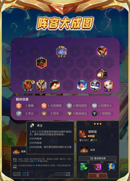 组成的阵容推荐为提莫、塔莉垭、加里奥、琴女、斯维因、维克兹、大头、波比,这些英雄可以形成4术士3德玛3约德尔2法师的羁绊。 强化符文的选取建议优先考虑潘多拉的装备、潘多拉的备战席和投资收益。其次可考虑术士之魂、黄金门票、快速思考和了解你的敌人、二费活力。