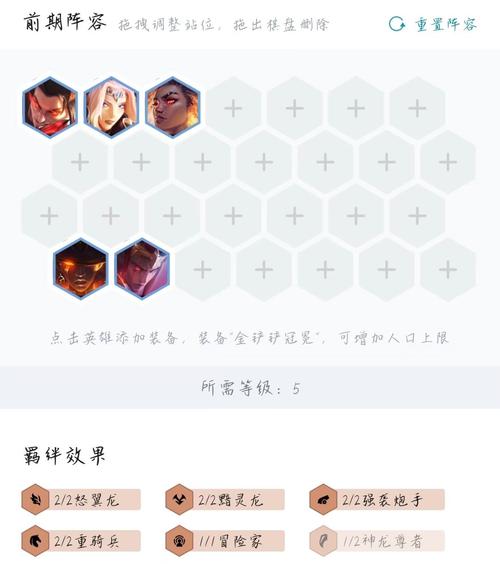 在金铲铲之战5赛季,金鳞龙阵容的核心英雄包括迭嘉、艾达丝、努努、亚索、索拉卡、永恩和蕾欧娜。这个阵容的核心在于迭嘉的输出能力以及金鳞龙羁绊带来的增益效果。如图所示,金鳞龙阵容的英雄布局和搭配能够有效地提升队伍的整体战斗力。