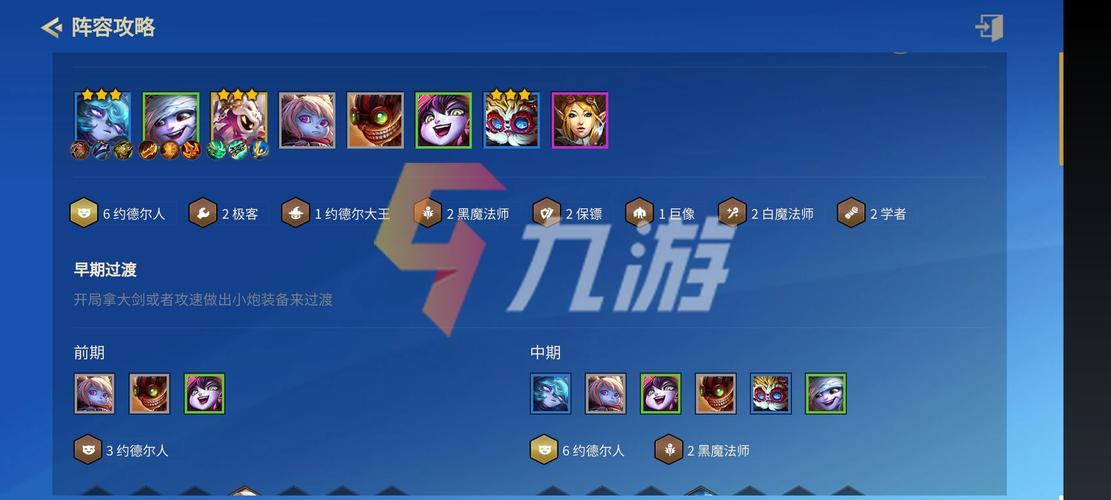 〖Four〗、在5级开启抽卡,确保至少有2张三星卡,保持血量稳定,避免在7人口时停留。7级后,挂上蔚,阵容达到稳定状态,存钱准备升至8人口,组建3圣盾,达到阵容顶配。装备分配 大嘴作为主C角色,推荐携带羊刀与巨杀。