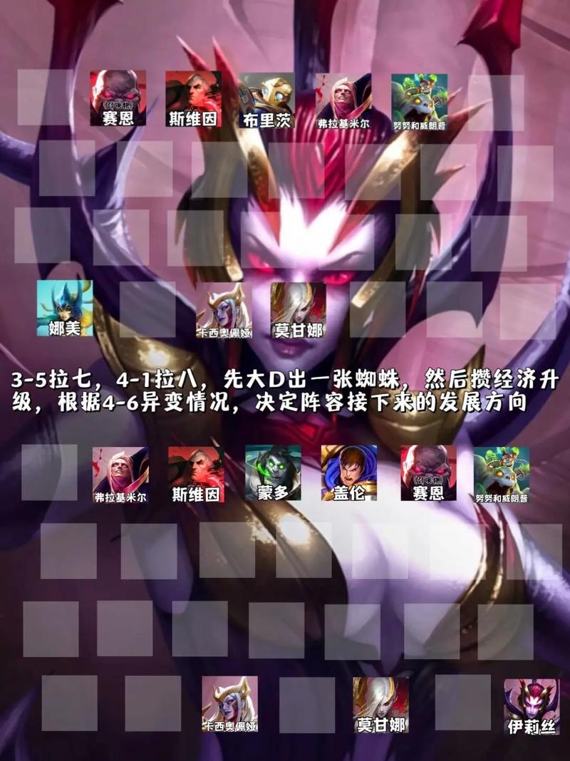 阶段2-1升4,2-5升5人口,过渡阵容推荐3星界+2格斗+3法师,3星界增加经济收入,拉克丝输出能力较高。装备优先圣杯,前排考虑日炎、传送门或石像鬼。3阶段3-2升6人口,调整阵容质量,若质量不足,优先寻找诺姆希与塞拉斯开5法+3星界+2格斗。