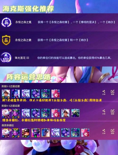 〖Two〗、阵容搭配构建一个由阿狸、千珏、纳尔、锤石、奥恩、辛德拉、安妮、沙皇和瑟提组成的阵容,以实现5灵魂莲华、4永恒之森、2法师、2护卫、2神谕者和2擎天卫的羁绊效果。装备选取辛德拉装备优先选头盔、头盔和法爆,备选蓝霸符、青龙刀或纳什,帽子可作为后期选取。