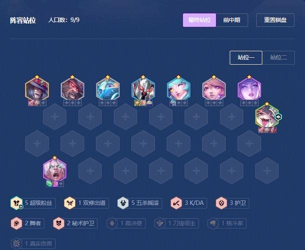 〖Two〗、传送门篇 多才多艺阵容 【萨勒芬妮+KDA】组合:7人羁绊,包含5法师、2秘术,优先考虑9人口补琴女,三星萨勒芬妮为关键,后期根据情况调整装备。【五杀刀锋天使】阵容:7人羁绊,3刀锋、3超粉,适合连败拉人口,天使三星后考虑上9人口补全羁绊。