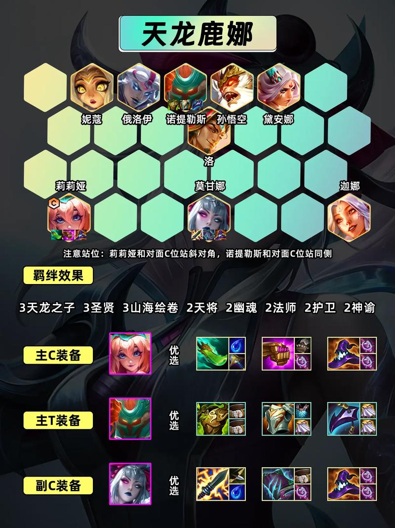 阵容一:豹女换形 豹女、纳尔、蜘蛛、乌鸦、妮蔻、希瓦娜、索拉卡构成阵容。若装备玉龙之心或玉龙纹章,可尝试6玉龙4变形师或继续6变形师。若索拉卡未出现,可补充怒翼龙,龙女亦能作为后期副C,实力强劲。豹女关键装备包括水银、羊刀,前者解控,后者加速输出。