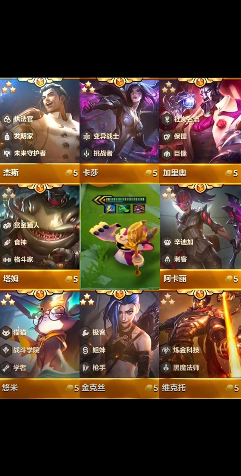 阵容组成:蔚、扎克、厄加特、迦娜、蒙多、厄加特、金克斯、塔姆、猫咪、杰斯(9人口大成阵容)。阵容羁绊:4格斗、3炼金、2执法官、2学者、2极客、2枪手、1猫猫、1食神、1未来守护者。