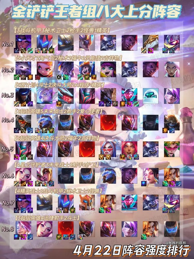 〖One〗、今天为大家推荐几个金铲铲之战黎明不错的上分阵容搭配推荐。重骑破败女枪 阵容需要角色:锤石,泰坦,猪妹,人马,女枪,铁骑,德莱文,努努,其中主C是女枪,副C是人马。女枪和人马是关键角色,装备三件套满上,星级达到三星,基本稳拿第一。女枪搭配绿刀,鬼刀,珠光护手;人马搭配龙爪,救赎,反甲。