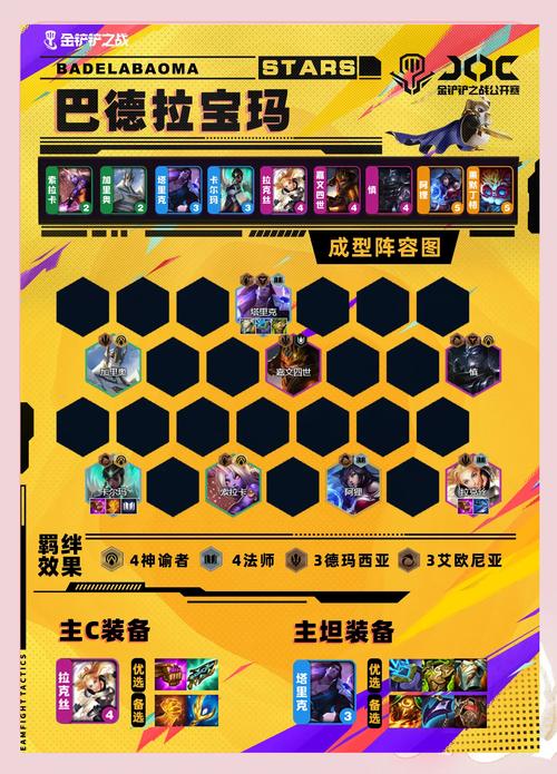 金铲铲之战上分阵容推荐——驯龙赛芬组合:核心棋子:黑默丁格、崔丝塔娜、璐璐、塞拉斯、赛芬、佐伊、巴德和索拉卡。羁绊搭配:3驯龙大师、1龙神、1窃法巧手、1唤星者、4幽影龙、2格斗家和2魔导师/3法师,形成强大的协同效应。