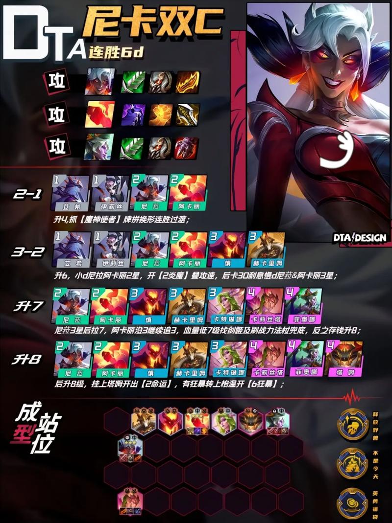 具体阵容组成:泰隆、魔腾、斯维因、布兰德、泽丽、蕾欧娜、辛德拉、卡兹克,54刺客2黑魔2海克斯。如果拥有刺客转职,可开启六刺阵容;如执事转职,则可构建七执事。