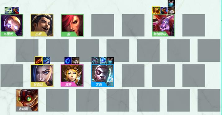 阵容组成阵容组成:布里茨、艾克、厄运小姐、烬、奥利安娜、布隆、艾瑞莉娅、金克斯阵容羁绊:4极客2精密2狙神2保镖1宿敌阵容变阵:后续有极客转职,优先开6极客。