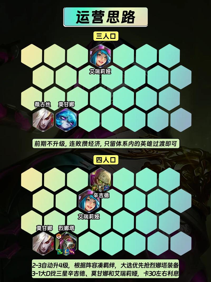 烈娜塔s5赛季阵容攻略阵容分析组成俄洛伊、瑟庄妮、雷克赛、塔姆、扎克、蔚、烈娜塔、希尔科、维克托6格斗 3炼金 2执法 2学者9人口后可搭配维克托与希尔科可极大增加阵容上限,希尔科微光羁绊开局给维克托与烈娜塔增加法力值,2枚棋子可快速释放技能,而维克托通常可释放2次技能敌方会瞬间被清屏。