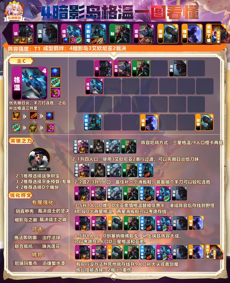 〖One〗、- 前期:重点争夺暴风大剑、反曲之弓和巨人腰带,力求连胜过渡。在3-2人口时,可以选取3神盾或3哨兵搭配其他羁绊。- 中期:在4-1人口时提升至7人口,厄斐琉斯加入后根据实际情况调整羁绊,如物理输出较多则加入铁甲,法系输出占主导则考虑熊菊复生组合。