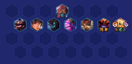 阵容搭配 棋子:以下为端游名字,金铲铲之战内可能会更改,玩家需自行对应。曙光女神蕾欧娜『1』、暗裔剑魔亚托克斯『1』、钢铁少女芮尔『4』、深海泰坦诺提勒斯『2』、正义巨像加里奥『4』、复仇之矛卡莉丝塔『1』、魂锁典狱长锤石『2』、武器大师贾克斯『4』。