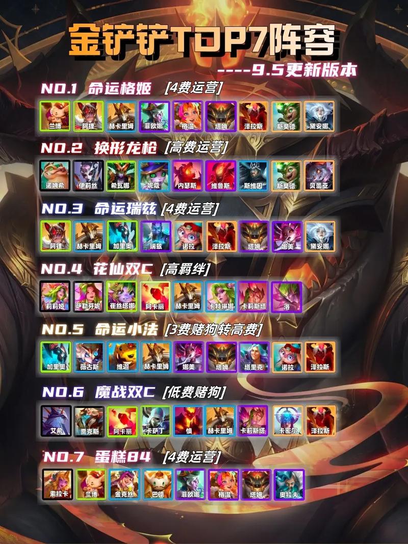 西斗之飒+蛛后+未来守护者+龙血武姬+狻猊之心+风黯。阵容解析:游戏中换形师属于大型的羁绊团体,在其变身之前实力并不大。但是换形师一般都有着非常厉害的生命加成值,并且有着一定的输出能力。一般会在游戏中后期发出奇效,变身之后玩家可以额外得到非常高的生命值。