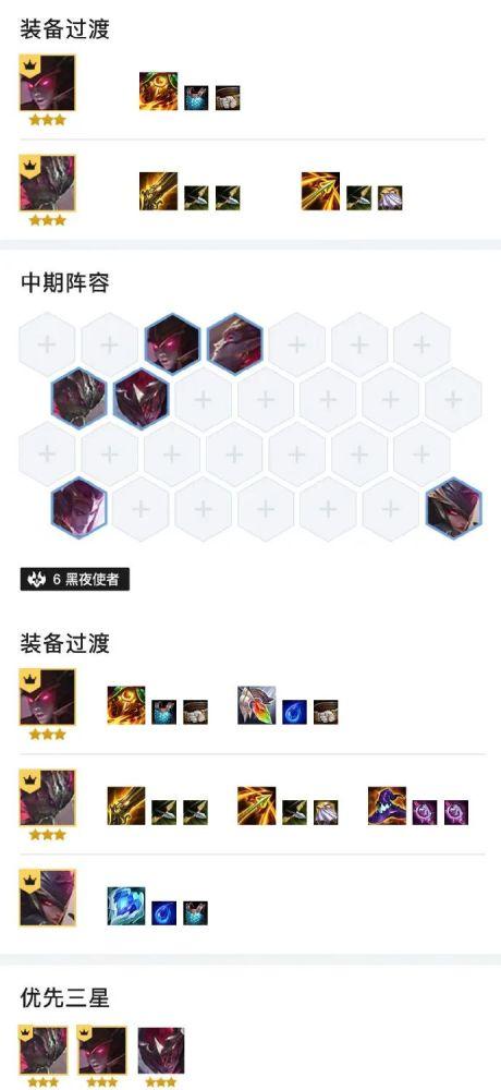 〖Three〗、阵容搭配:- 核心棋子:梦魇、皎月、狗熊、翠神、派克、佛耶戈、稻草人、璐璐 装备选取:- 梦魇:由于其伤害能力并未削弱,装备选取上优先寻找黑棋子的替代品,以保持复生效果。最佳选取是疾射光明火炮,其次是基克的调和,再次是卢安娜的风暴或至速水银。