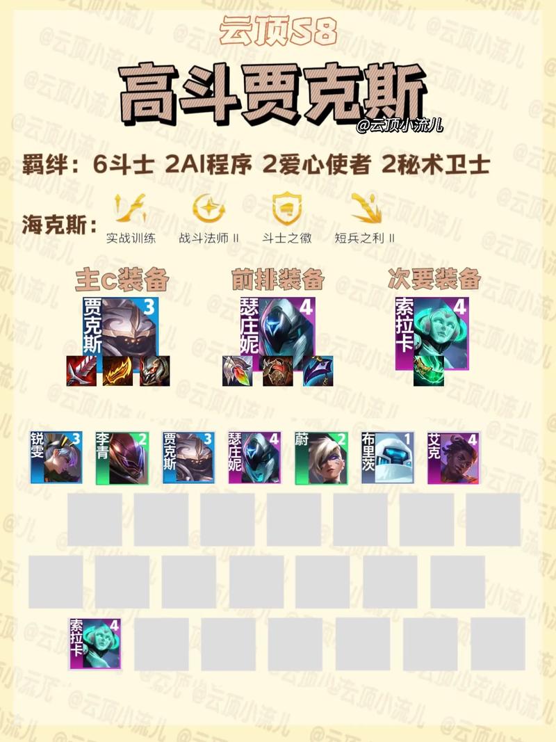 〖Three〗、赌青钢影的最终阵容包括3混沌战士、3秘术、2AI、2吉祥物、2淘气包、2黑客、2福牛等羁绊与英雄组合。艾克、牛头、努努、佐伊等英雄灵活卡位,根据情况可替换为其他羁绊或英雄,以适应不同战局。装备分配 青钢影主C,装备推荐无尽、泰坦、饮血/正义。曙光则需要肉装,如狂徒、反甲、日炎等。